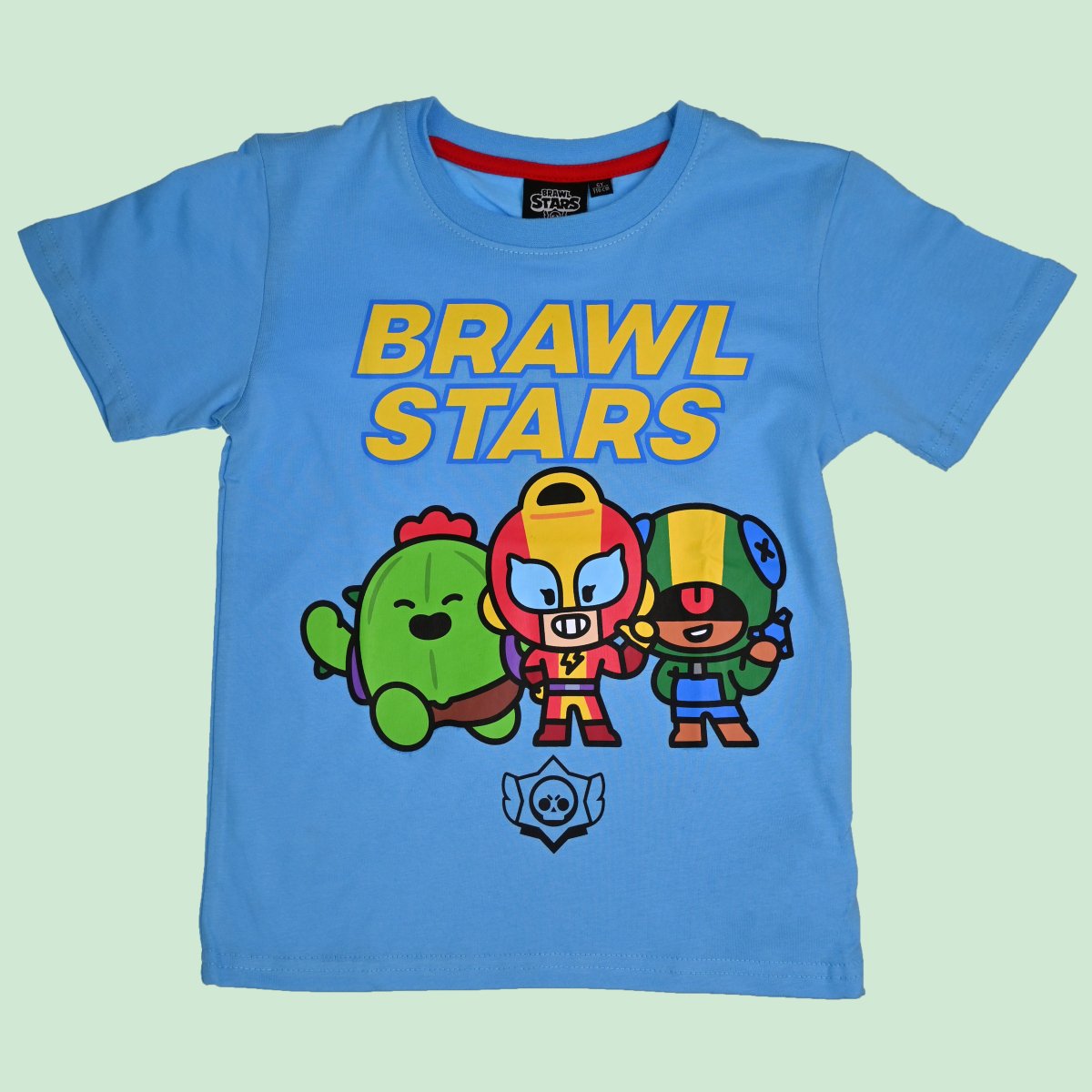 The t-shirt features a vibrant and colorful print featuring three of the popular characters from the Brawl Stars series, Spike, Max and Leon. The text "BRAWL STARS" in an energetic yellow gives the garment a playful and dynamic feel that will appeal to your child's sense of adventure and interest in gaming.