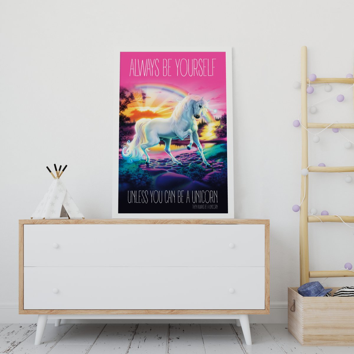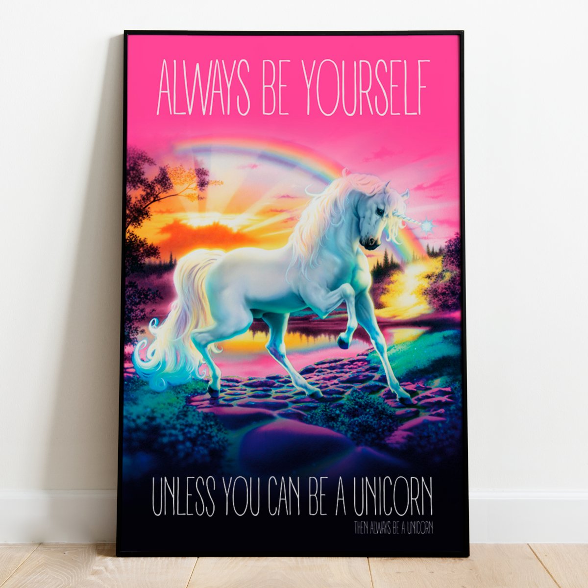 The poster is printed on the highest quality 170 g/m² paper, ensuring that the image's details, colors and textures are brought out in the most vivid way. The inspiring text: "Always be yourself, unless you can be a unicorn – Then always be a unicorn", stands proudly next to the unicorn, giving a sense of wonder and self-worth to all who see it.