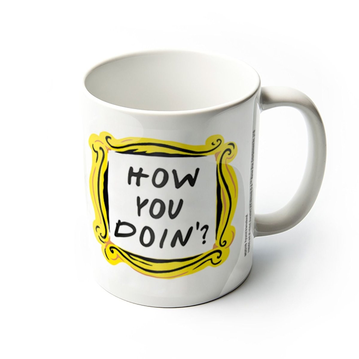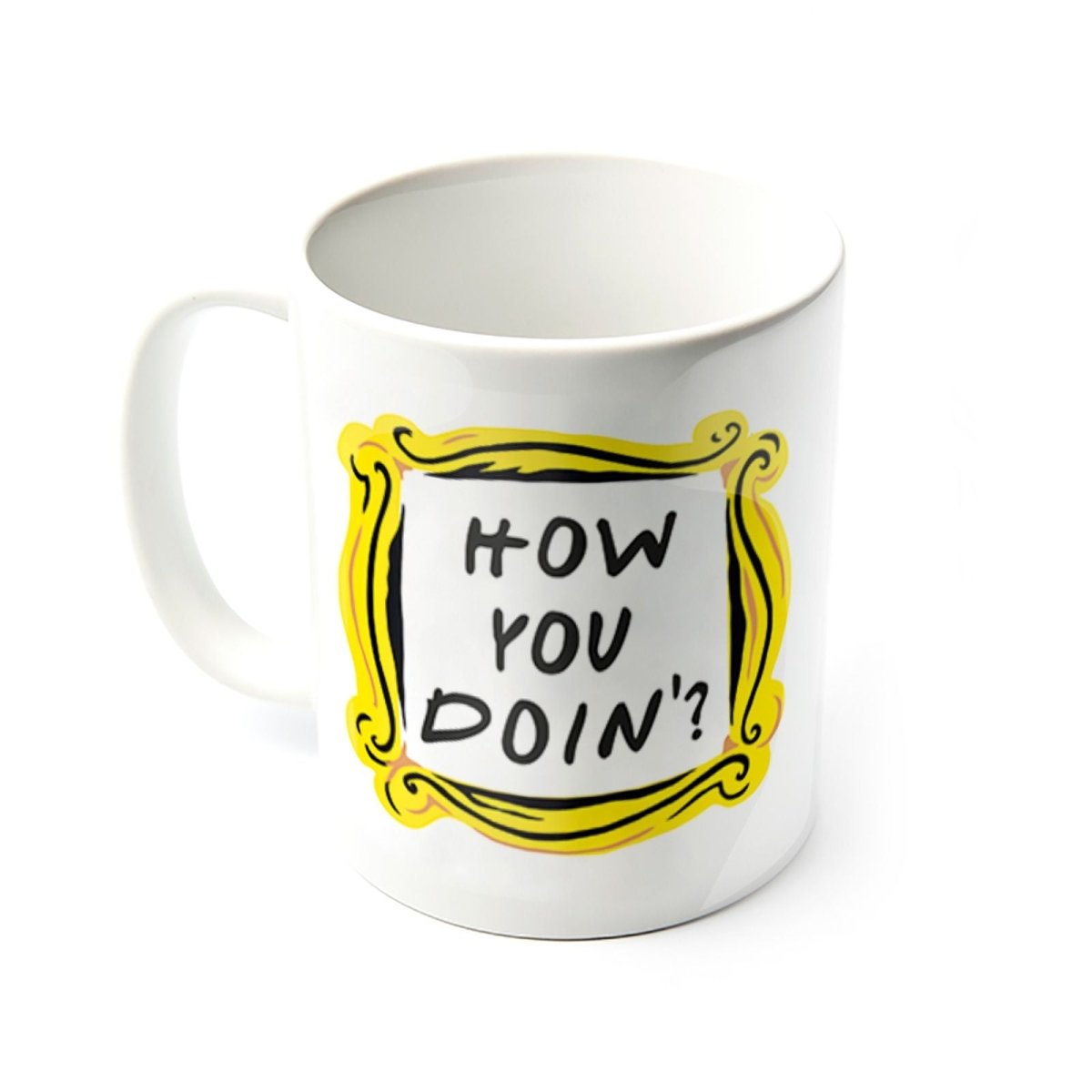 This "How You Doin'?" mug is perfect for a Friends fan looking for a fun way to start their day. Featuring the iconic question from Joey Tribbiani, this mug brings a good dose of nostalgia and humor to your coffee break. Enjoy your coffee or tea with this stylish mug that pays homage to the classic TV series.