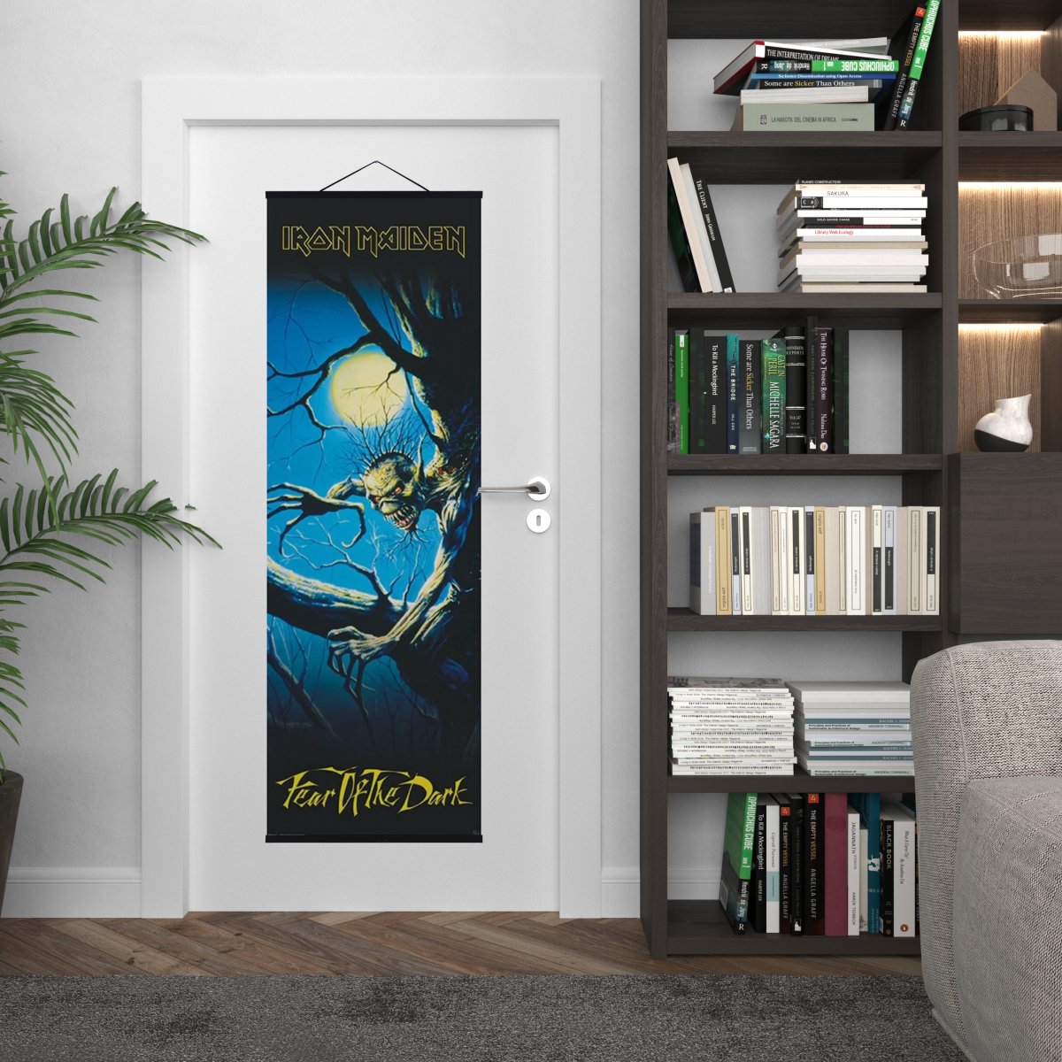 Transform your room into a tribute to the legendary heavy metal band Iron Maiden with this impressive door poster. The poster features a dramatic and dark motif from the band's famous album "Fear of the Dark", making it an incredibly attractive decoration for any music enthusiast.