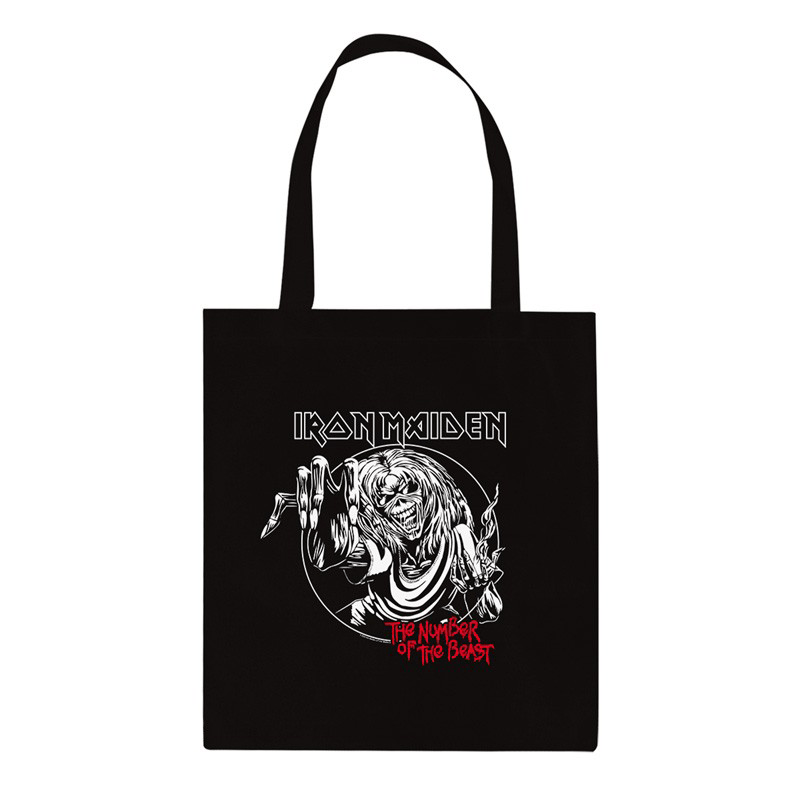 Show your love for heavy metal with this stylish Iron Maiden Tote Bag featuring the classic "The Number of the Beast" motif. This black tote bag is made from 100% cotton, printed with eco-friendly dyes and sustainably produced. The bag measures 37 x 42 cm and has practical handles, making it perfect for everyday use.