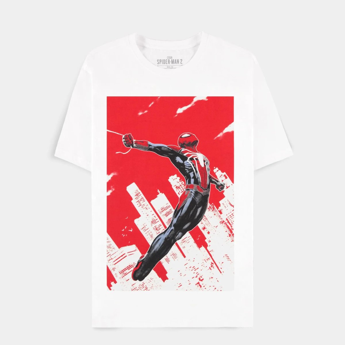 Perfect for a Spider-Man fan who wants to express their love for the iconic hero! This white T-shirt features a classic motif of Spider-Man taking a bold turn between city skyscrapers, wielding his trusty web. The design captures the spirit of adventure and the friendly neighborhood hero, adding a unique touch to your outfit.