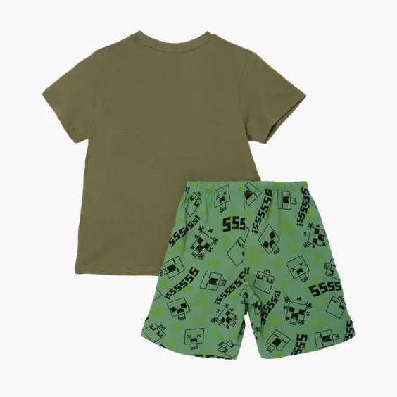 Explore the Minecraft universe with your child while they sleep sweetly in these exciting Minecraft pajamas. The t-shirt is green and is decorated with three baby creepers and TNT blocks, as well as the text "BOOM!", which will excite all little Minecraft enthusiasts. The shorts, also in green, have a fun pattern of creepers and the text "Sssss" spread across the shorts.