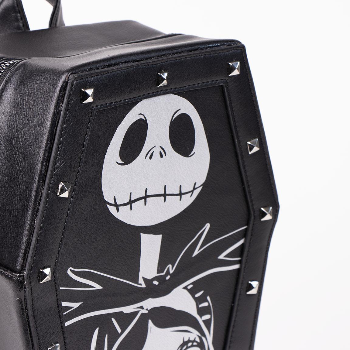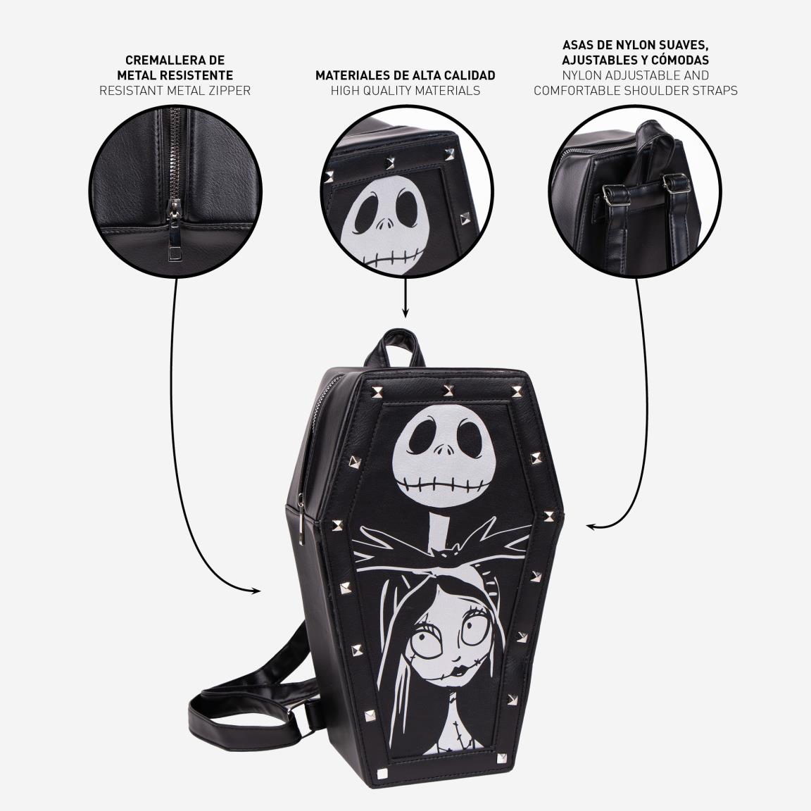 For fans of the iconic film "The Nightmare Before Christmas", we now offer a unique and stylish backpack of approximately 6 liters that will catch the attention of everyone who sees it. Designed with the distinctive aesthetic of Tim Burton's famous work, this backpack is shaped like a coffin and comes in a captivating black and white color. It is the perfect companion for adventures, both in and outside of Halloween town.