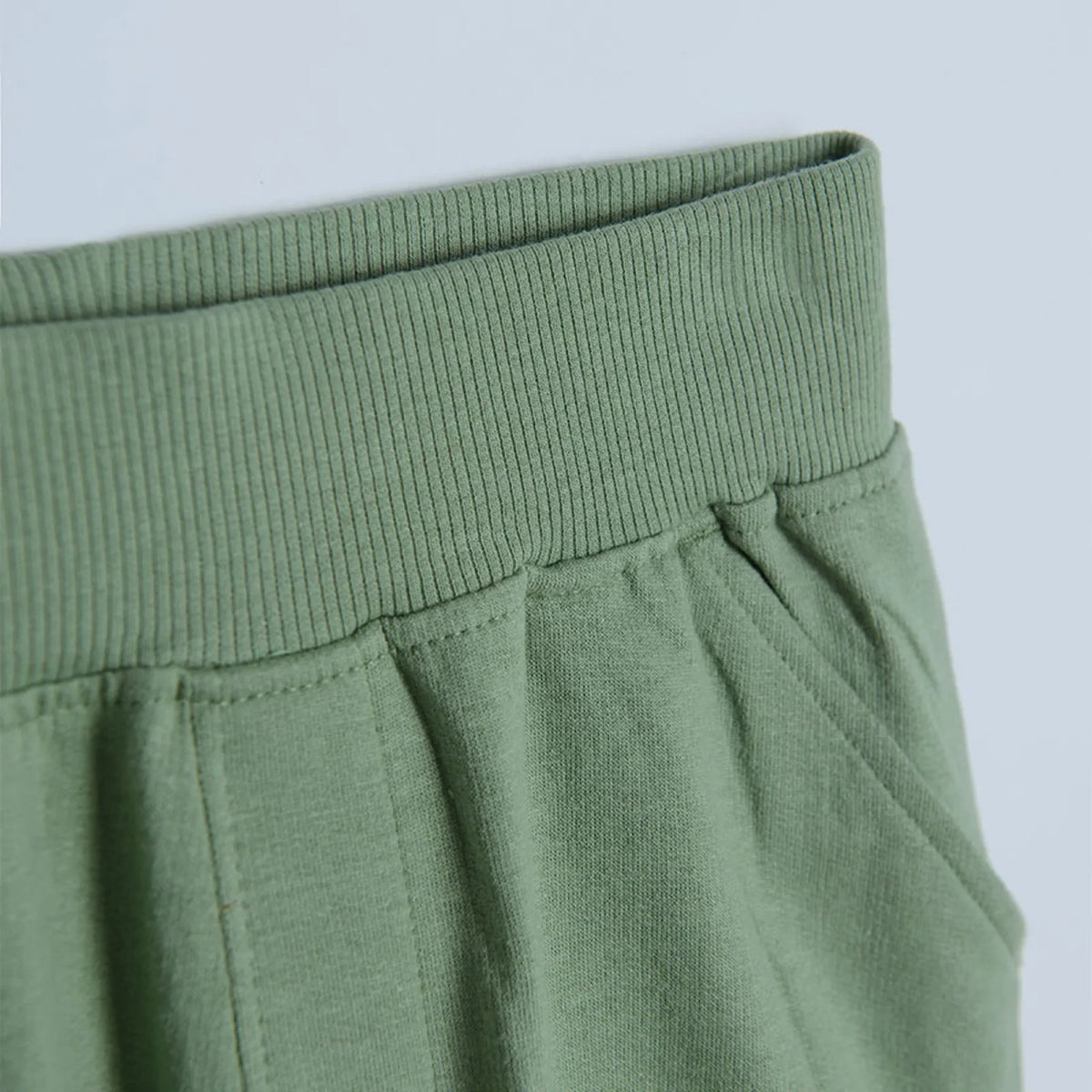 The shorts feature a ribbed waistband for an adjustable and comfortable fit, and practical pockets for storing small treasures and essentials. This garment is ideal for sunny days and outdoor activities.