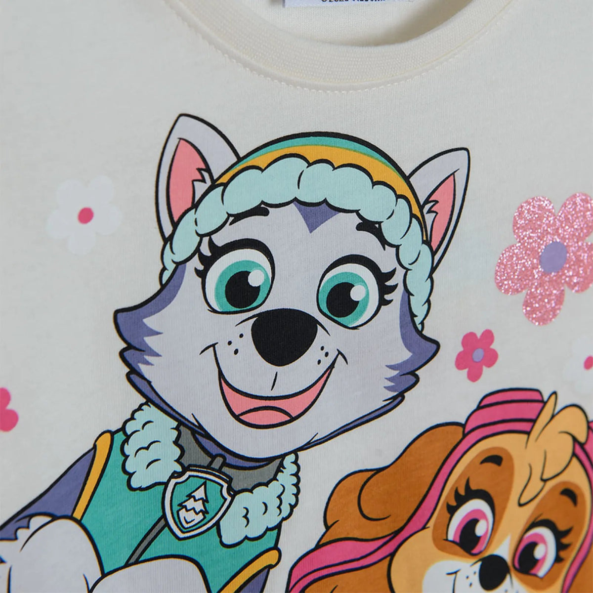 The t-shirt in this pajama set features a colorful and vibrant design that shows beloved Paw Patrol characters Skye and Everest standing on a rainbow. The text "smile" follows the shape of the rainbow, sending a positive and optimistic message to your child. Floral details in pink glitter add extra sparkle and visual interest to the t-shirt.