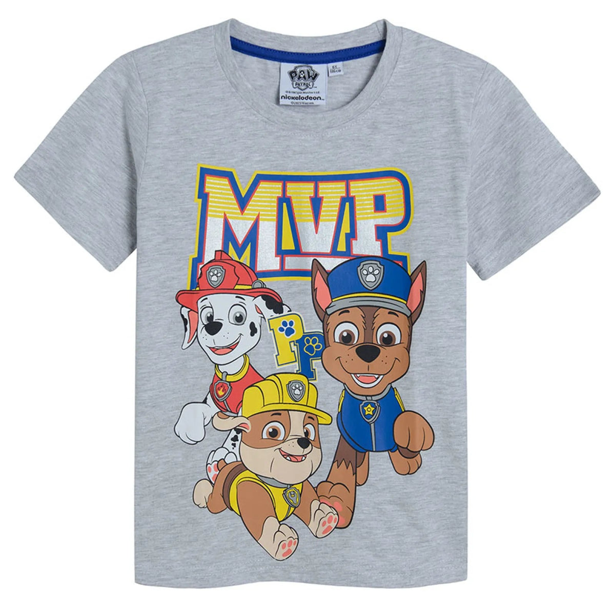 This Paw Patrol t-shirt is perfect for any little fan of the brave pups. The t-shirt features a cool print of Rubble, Marshall and Chase, adding a fun and lively feel to the outfit. The text "MVP" printed in silver metallic font adds an extra touch of stylish shine to the t-shirt.