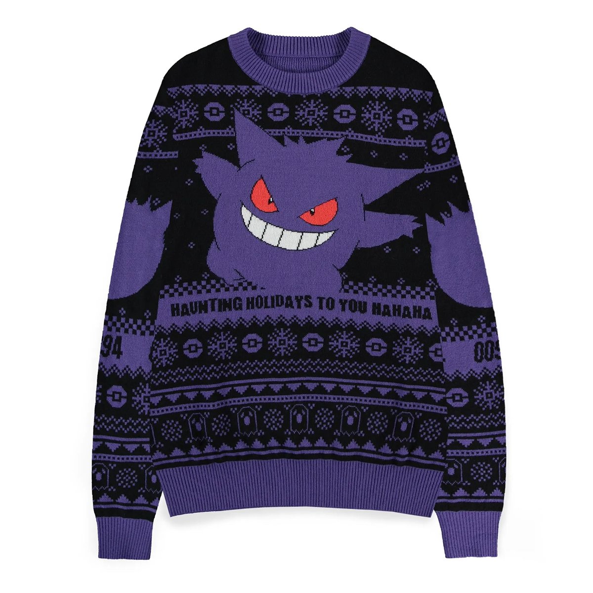 Get in the holiday spirit with our Pokémon Gengar Christmas Sweater! Perfect for a Pokémon fan, this cool sweater combines a classic Nordic design in black and purple with the iconic Gengar motif on both the front and back. With the text "Haunting Holidays to You HaHa" it gives it a unique, festive touch that stands out.