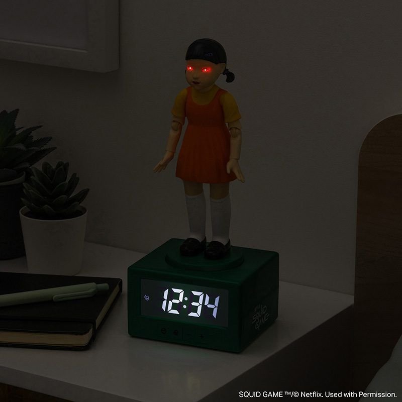 Wake up in true Squid Game style with this unique Squid Game alarm clock! Inspired by the iconic "Red Light, Green Light" doll, this clock will make sure you never oversleep again. When the alarm goes off, the official theme song from the series' first game plays - a guaranteed effective way to start your day!